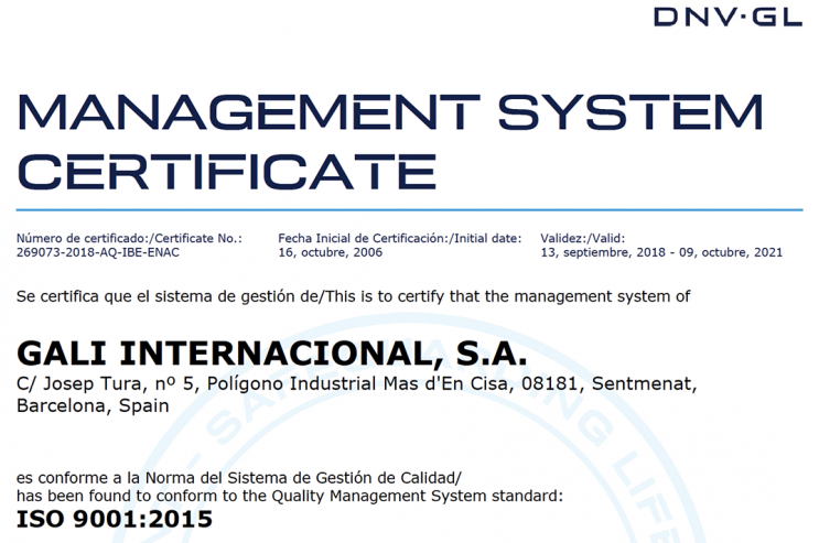 Gali Group is constantly trying to improve and invest to get the principal certifications for the different product lines of Gali, as you can see in our certifications page on the Website, to assure to our clients the maximum quality both in our process of production and final product.