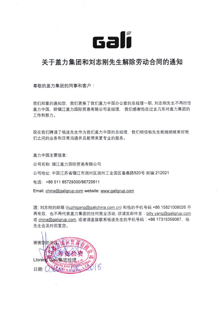 Here we announced that our General Manager in China branch office of Mr. Liu Zhigang will be resigned from our group for personnel reasons, we thank you for his work and contribution to Gali in the past years.